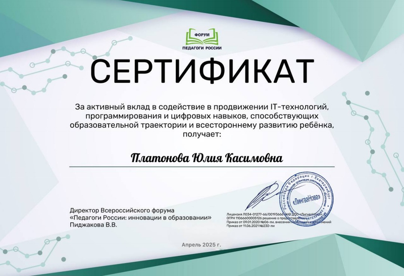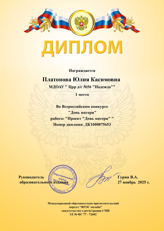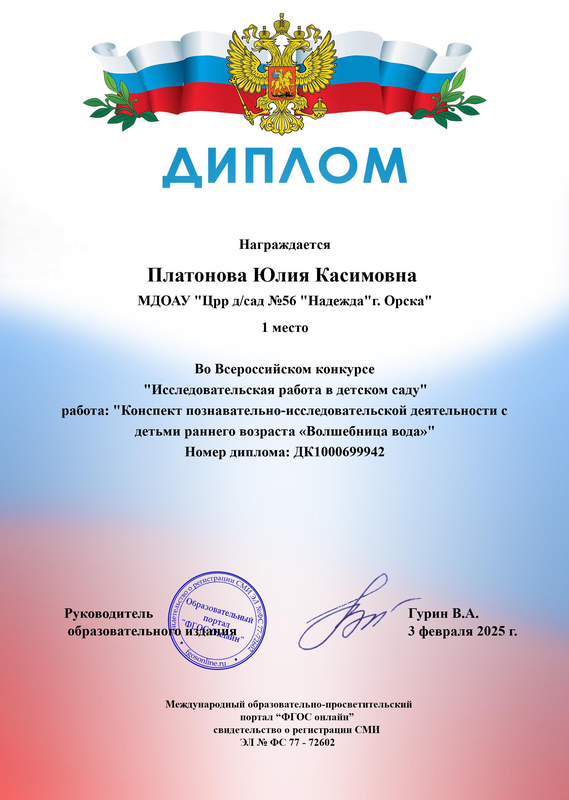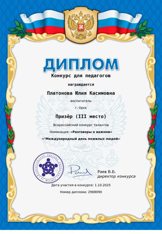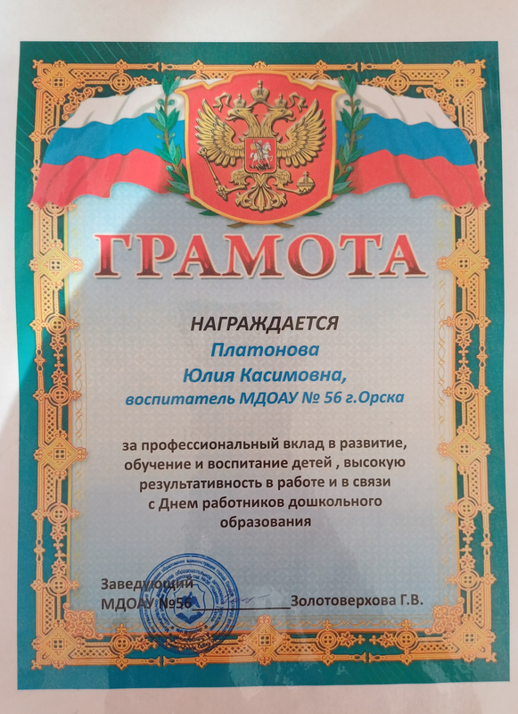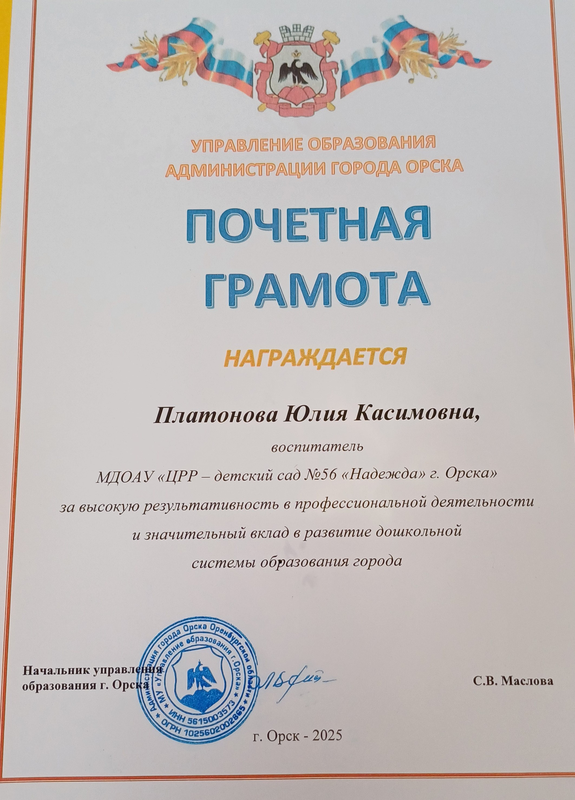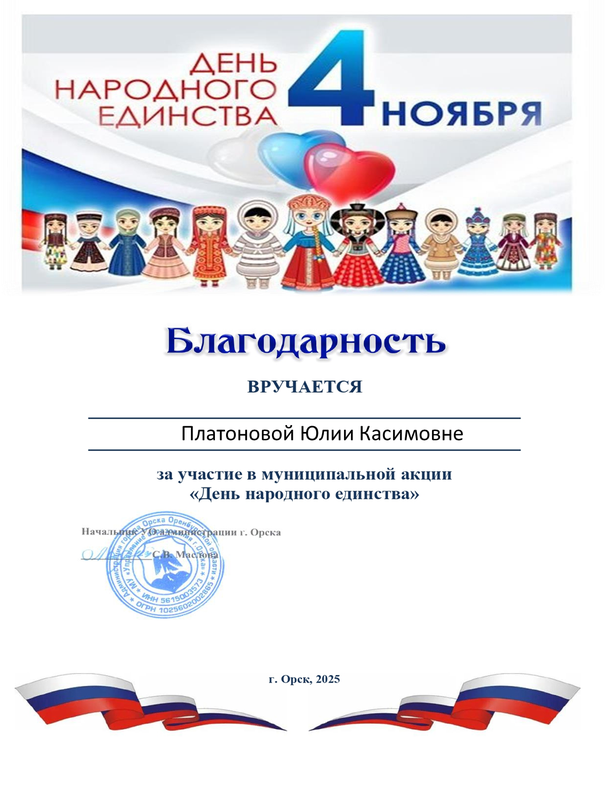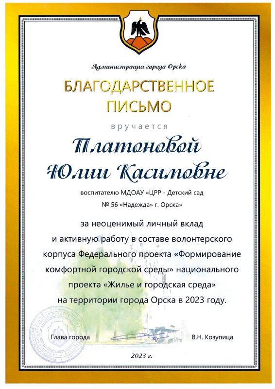 Благодарственное письмо от Администрации города за неоценимый личный вклад и активную работу в составе волонтерского корпуса Федерального проекта «Формирование комфортной городской среды» национального проекта «Жилье и городская среда» на территории города Орска в 2023г._